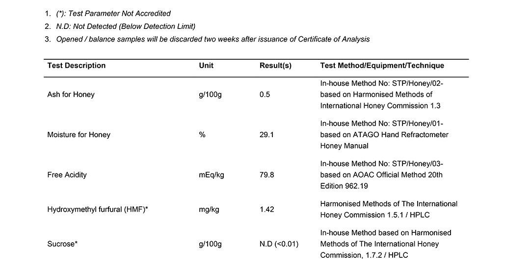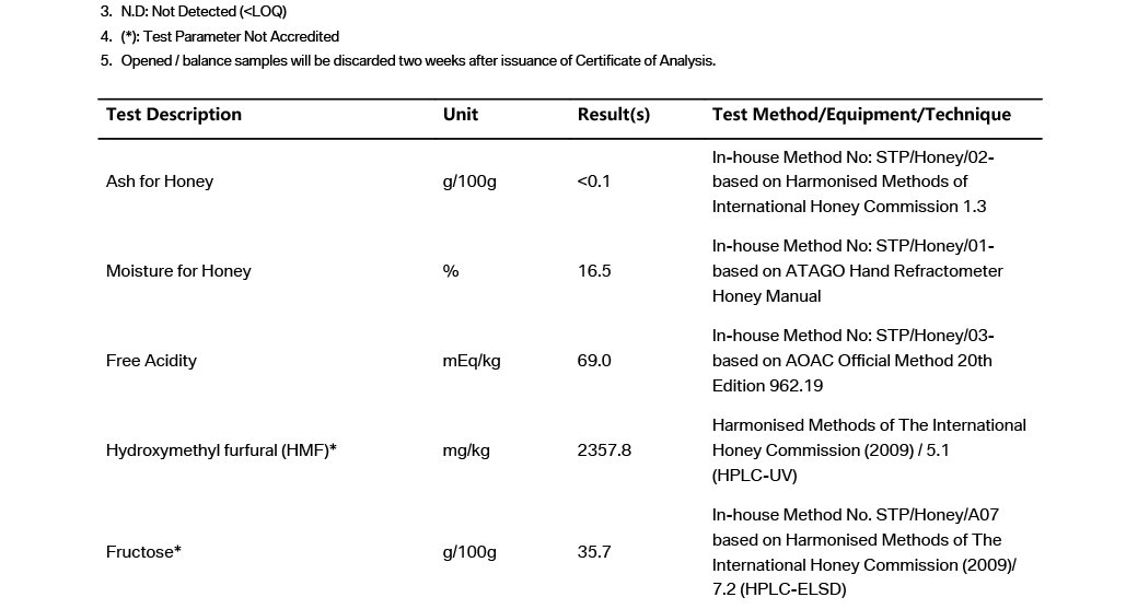 AISANA Honey Analysis Test Result